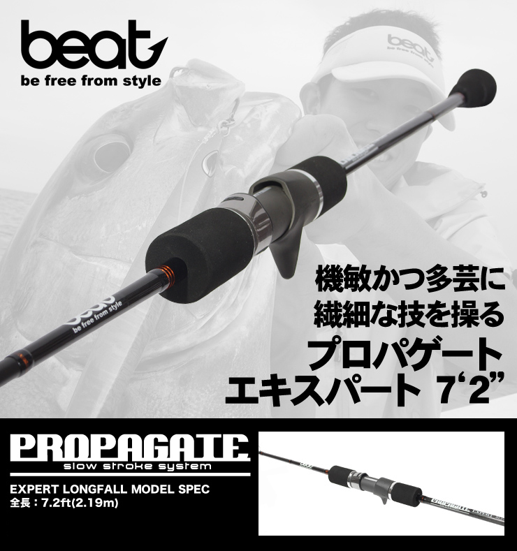 スローピッチに要求されるディープレンジからの伝達性能protagateのカーボンマテリアルは超高弾性40tカーボンと高弾性30tカーボンのbeat独自のコンポジットカーボンを軸に設計。スロー系ジグを精密コントロールする為に6フィート6インチの超高感度パラポリックアクションブランクをパッドエンドまでフルに曲げて使えるスローピッチ専門ロッド。すべては感度を極限まで高めるため、プランク塗装は防水の為だけのプライマーフィニッシュ。ガイドは各機種フルチタン小口径ガイド#2#3はトップ径5.5、#4は6.0を採用。今までに感じなかった海底の情報量の多さを実感していただける竿、それがプロパゲートです。
