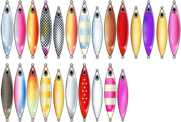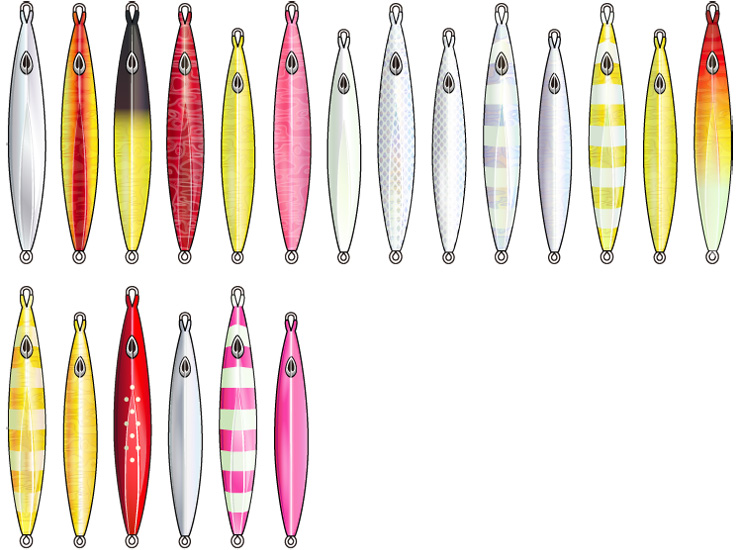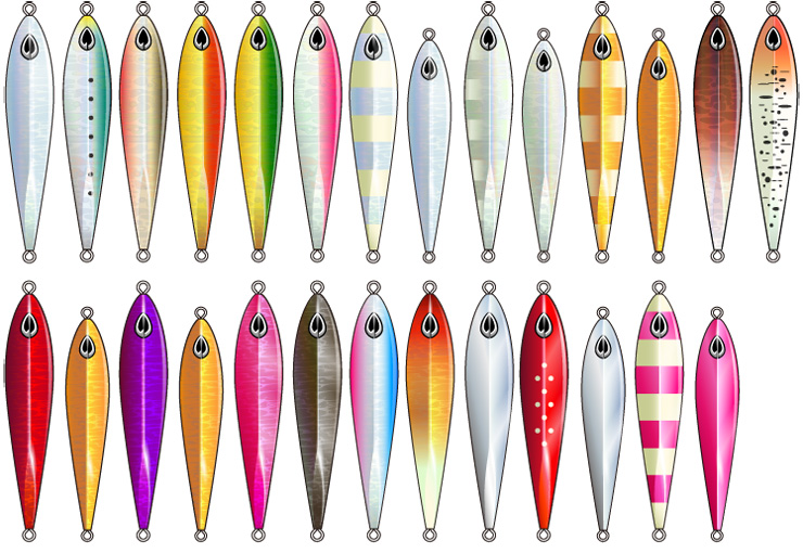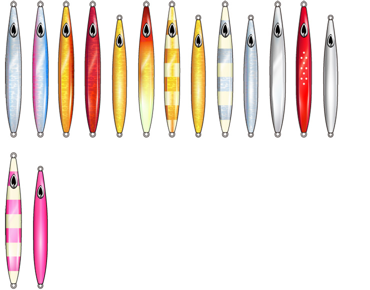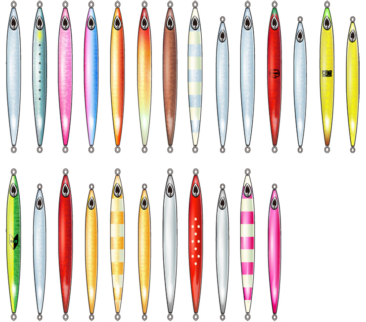 | ■シルバー ■マイワシ ■ナチュラルオレンジ ■レッドゴールド ■グリーンゴールド ■ピンクグロー ■ゼブラグロー ■エッジゼブラグロー S ■エッジゼブラグロー G ■イカグロー ■オレンジグローポイント ■半面レッドゴールド ■半面パープルゴールド ■フルピンク ■フルスモーク ■ブルーピンク ■レッドヘッドグロー ■アルミシルバー ■半面レッドスポッドグロー ■フルピンクゼブラグロー |