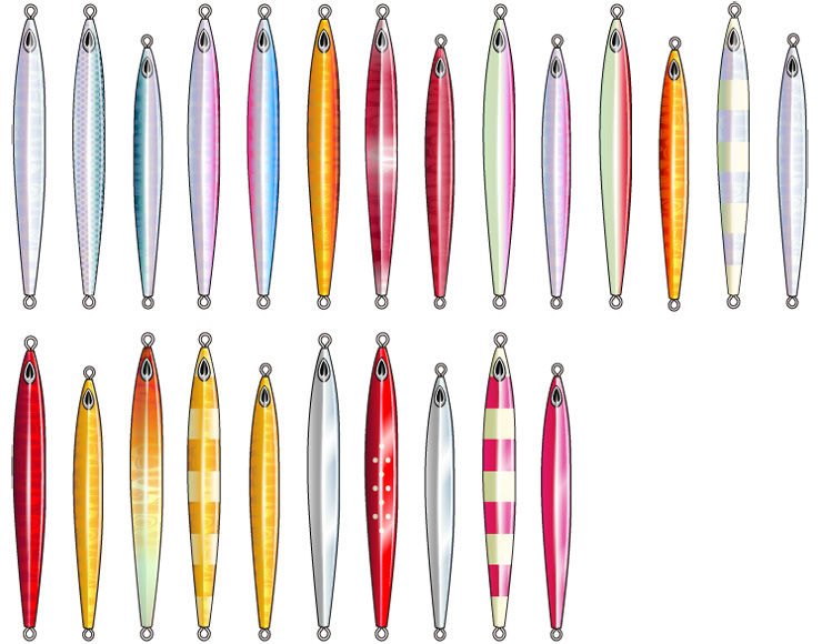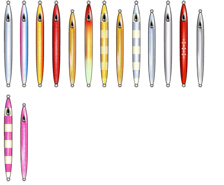 | ■シルバー ■マイワシ ■ナチュラルオレンジ ■レッドゴールド ■グリーンゴールド ■ピンクグロー ■ゼブラグロー ■エッジゼブラグロー S ■エッジゼブラグロー G ■イカグロー ■オレンジグローポイント ■半面レッドゴールド ■半面パープルゴールド ■フルピンク ■フルスモーク ■ブルーピンク ■レッドヘッドグロー ■アルミシルバー ■半面レッドスポッドグロー ■フルピンクゼブラグロー |