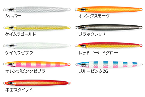 スクエマDの開発コンセプトは深いレンジでより軽く軽快に操れるジグ。Squama(スクエマ=ウロコ)は名前の通りボディに規則正しくウロコ目を刻むことにより水圧を味方に。 ジャーク時にはサメ肌効果により水圧の掛かるボディー表面の摩擦が軽減。 一方ひと度ジグ本体がスライドから水平姿勢に入りフォールを始めると表面増加によりジグの沈下速度は遅くなりバイトを誘発する時間もそれに伴います。 スクエマDのテストではジグを操るのには不利な太いPEラインを使用してのディープレンジの大型カンパチ狙いでいかにアングラーへの負担を軽減し、いかにディープレンジでも確実にキレのある動きを出せるか?度重なるテストを繰り返し出来上がったボディ形状はスクエマシリーズで最もファットでコンパクトなボディ形状でした。勿論スローピッチジグメーカーbeatでは前後2×2の4本針でもテーリングを起こしにくい本体バランスも考慮しており細い糸を使用する近海での中深海でもその効果は顕著です。