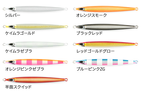 Squama(スクエマ=ウロコ)は名前の通りボディに規則正しくウロコ目を刻むことにより水圧を味方に。 ジャーク時にはサメ肌効果により水圧の掛かるボディー表面の摩擦が軽減。 一方ひと度ジグ本体がスライドから水平姿勢に入りフォールを始めると表面増加によりジグの沈下速度は遅くなりバイトを誘発する時間もそれに伴います。 スクエマSLは肉厚でありながらもウロコ目を入れることにより軽い抜けを実現しアングラーの負担を軽減します。また直線的な重い水押しを伴い安定したスライドを発生しヒラマサ、マグロ類、青物全般に有効。 フックセッティングにおいても度重なるテストを繰り返しスローピッチから派生したbeatはフロントオンリーからスローで多用する前後4本での使用も可能にし喰い渋りの魚達にも有効なセッティングを可能にしました。 従来のベイトタックルを使用したバーチカルからスピニングタックルでのべベルの釣りまでスタイルによらず軽快い操れるジグ。ハイレスポンスセミロングジグ誕生。